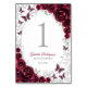 Burgundy silver Quinceanera celebration table number cards. Features, script font, silver butterflies, watercolor roses and tiara. Perfect for an elegant princess style glam celebration. Personalize with your own details. Printed Zazzle invitations or instant download digital printable template.