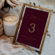 Esta delicada mesa de hambúrgueres de caligrafia em ouro é perfeita para um casamento moderno. A design romântica minimalista apresenta uma magnífica e elegante tipografia amarela ouro champanhe num fundo vermelho burgundy com um aspecto simples e limpo. A placa impressão na frente e atrás (lado duplo). Os itens são impressos exatamente como aparecem na tela quando você adiciona ao carrinho, por isso personalize e adicione cada número de tabela que você precisa ao carrinho individualmente.