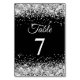 Números elegantes de mesas de casamento com uma caligrafia moderna de escrita emparelhada com uma fonte moderna de todos os bonés. O texto do número da tabela é duplicado na frente e atrás. Você pode alterar a cor ou o estilo da fonte. A imagem gráfica de fundo apresenta falso brilho prateado sobre uma cor preta sólida personalizável. Qualquer brilho glamouroso é uma criação digital.