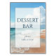 This wedding tabletop sign features a serene beach scene with gentle waves and fluffy clouds, creating a tranquil seaside atmosphere. The design uses soft blues for the ocean and sky, warm beige tones for the sand, and subtle whites for the clouds and foam. A centered rectangular overlay enhances readability, displaying "DESSERT BAR" in bold serif font followed by "please take a treat" in smaller, italicized lettering. The overall style is realistic yet slightly stylized, evoking a peaceful and inviting mood perfect for a relaxed gathering where guests can enjoy sweet treats.