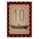Um cartão de lugar da mesa de casamento com ilustração de uma canoa verde sobre uma xadrez vermelha e preta e estoque de papelão inspirado.