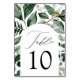 Cartões de mesa de casamento elegantes e botânicos com o número da mesa aninhados em um quadro arquitetado cercado por eucalipto, samambaias e outros ricos verdes. Personalize o número de cada placa de mesa e adicione-o ao seu carrinho. Projetado para coordenar com nossa coleção de casamento Abundant Greenery.