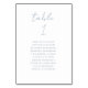 Esta elegante carta de número da mesa de casamento moderna apresenta a palavra "mesa" em um roteiro de escrita manual azul empoeirado sobre fundo branco. Adicione os nomes dos seus convidados que estão atribuídos a cada mesa em fontes de sans serif azuis empoeiradas.