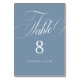 O Elegante Script Dusty Blue Wedding Table Number apresenta um script grande e ousado e um estilo elegante.