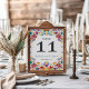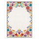 Esta design da Mesa Núplice Botânica Mexicana Boda Flores Mostra um arranjo floral rico e vibrante ao redor das bordas, com cores ousadas como vermelho, laranja, azul, roxo e amarelo que criam um sentimento festivo e acolhedor. As flores são intricadamente combinadas com padrões folhosos e pequenos e detalhados embelezamentos, dando ao design um olhar vivo e texturizado. O equilíbrio entre cores brilhantes e contrastantes e o arranjo delicado e simétrico fazem disto uma opção atraente para uma papelaria de casamento celebratória, especialmente aquela com um tema tradicional ou folclórico.