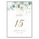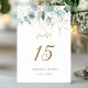 Este número da mesa de casamento apresenta cores aquáticas pintadas de eucalipto, folhas botânicas verdes e douradas com guião dourado.