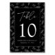 Cartão de número da mesa de casamento elegante que mostra a palavra "Mesa" em um roteiro branco manuscrito com o número da tabela, seus nomes e data de casamento mostrados abaixo. O fundo apresenta um padrão de folhagem preto e branco. O design repete atrás. Para solicitar as placas de número da tabela, basta digitar cada número e adicioná-lo ao seu carrinho.