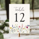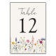 Placas florais elegantes de números de mesas de casamento com flores silvestres e folhagem de cor d'água em tons cor-de-rosa, amarelo, roxo, azul e verde junto ao fundo do design num fundo creme. O design repete atrás. Os cartões de mesa de casamento rústicos de flor silvestre são perfeitos para casamentos de primavera e verão. Para solicitar as placas de mesa: adicione cada número ao carrinho individualmente e faça check-out quando terminar.