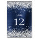 Números elegantes de mesas de casamento com uma caligrafia moderna de escrita emparelhada com uma fonte moderna de todos os bonés. O texto do número da tabela é duplicado na frente e atrás. A imagem gráfica de fundo apresenta falso brilho prateado e marinho azul esfregado em folha metálica. Qualquer brilho glamouroso é uma criação digital.