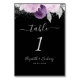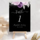A borda superior deste elegante e moderno número da mesa de casamento apresenta um buquê floral em tons de roxo e lavanda, aparado com folha de falso prateado e folhagem falsa e aspergido com brilho de prata. A palavra "mesa" aparece em uma escrita branca de cinza prateada em fundo preto, com o número abaixo, juntamente com os nomes do casal e a data do casamento.