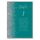 A borda esquerda desta elegante e moderna placa de número da mesa de casamento apresenta uma borda cintilante de falso prateado. A palavra "mesa" aparece em cinza prateada, escrita à mão, sobre fundo azul lacrimogêneo. Adicione os nomes dos seus convidados que estão atribuídos a cada mesa.