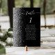 A borda esquerda desta elegante e moderna placa de número da mesa de casamento apresenta uma borda cintilante de falso prateado. A palavra "mesa" aparece em cinza prateada e escrita à mão em fundo preto. Adicione os nomes dos seus convidados que estão atribuídos a cada mesa.
