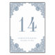Cartão de número de mesa de casamento azul empoeirado e elegante, com renda floral e uma letra elegante. Itens correspondentes disponíveis.