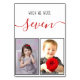 Uma maneira moderna e mais original de personalizar seus números de mesas com fotos de noiva e noivo na infância, na idade de tal número (o padrão é sete). As fotos marcantes de uma garotinha (a noiva) e de um menininho (o noivo) estão em quadros pretos, na metade inferior. Na parte superior, há a mensagem "quando tínhamos sete anos", com a idade escrita num guião vermelho e o resto acima, em bonés negros menores (letras de mão). As fotos marcadoras são de Pixabay e Dominio público Pictures e são gratuitas para uso comercial.