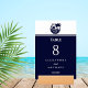 Elevem a sua celebração na praia com esta elegante e personalizada carta de números da mesa de casamento costeira, com um design gráfico chico de uma palmeira azul marinho, a ascensão do sol acima do oceano, e pássaros pacíficos — todos lindamente enquadrados dentro de um círculo marinho. Colocada contra um fundo branco e marinho na moda, esta carta captura perfeitamente o espírito sereno de um casamento de palmeiras pelo mar. Com vibrações tropicais e fontes sofisticadas de tipografia e escrita de caligrafia, é um na moda e eterno adicional à sua decoração de casamento na praia. Ideal para marcar seu número de tabela no estilo clássico de verão.
