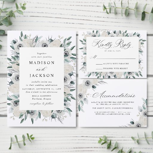 Cartões de números de tabela florais elegantes, com o número da tabela, seus nomes e data de casamento moldados por anêmonas brancas de aquarela, rosas de marfim e folhas verdes de sábio escuro. O design repete-se no verso. Projetado para coordenar com nossa coleção de casamento de Anêmonas Brancos e Rosas. Para solicitar este design, personalize os números de tabela um a um e adicione-os ao carrinho individualmente.