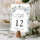 Placas florais elegantes de números de mesas de casamento com o número da mesa, seus nomes e dentro de casamento de um arco floral de rosas brancas e azuis poeirentas, hidrangeas, folhas de eucalipto e verde. Os números das mesas florais empoeiradas são perfeitos para o seu primavera ou casamento de verão. Projetado para coordenar com a nossa coleção de casamento Elegante Dusty Floral.