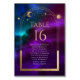 Números de Mesa de Casamento com Nomes de Convidados, com Astronomia Roxo Cósmica Sun Moon Teal Moon, apresenta um raio solar dourado, lua e estrelas sobre um fundo celeste. Dentro é o número da tabela com os nomes de convidados. Personalize editando o texto nas caixas de texto. NOTA: personalize com os números de tabela um a um e adicione ao carrinho individualmente. Projetado para você pelo Evco Studio www.zazzle.com/store/evcostudio