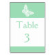 Belo design de cartão de número da mesa de casamento com uma silhueta branca de borboleta em uma cor verde de fundo da casa da moeda. Há também um texto que lê "Mesa" junto com um número personalizável.