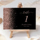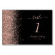 A borda esquerda deste elegante número da mesa de casamento moderna apresenta um rosa dourado faux glitter design. O texto personalizável combina letra rosa pálida, letra copperplate e letra itálico num fundo preto.