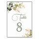 Cartão elegante de número de tabela com lindas folhas e tipografia moderna.