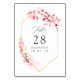 Cartões de número de mesa de casamento floral em aquarela rosa com flor de sakura com moldura geométrica dourada personalizável para os detalhes do seu evento.