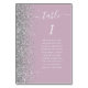 A borda esquerda desta elegante e moderna placa de número da mesa de casamento apresenta uma borda cintilante de falso prateado. A palavra "mesa" aparece em um guião branco e branco de escrita manual sobre um fundo roxo lavanda empoeirado. Adicione os nomes dos seus convidados que estão atribuídos a cada mesa.