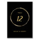 Este número da mesa de casamento apresenta uma falsa estrutura em círculo dourado e uma simples caligrafia com fundo preto.