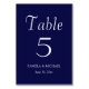 Guie seus convidados de recepção de casamento para a mesa com esta placa de número de tabela de estilo simples que contém uma inscrição branca e estilizada em um plano de fundo de cor azul de marinho e de tendência. Design está em cada lado da placa. Edite seu cartão para alterar o número da tabela, os nomes dos casais de casamento e a data. Cartões de pedido separados para cada número de tabela.