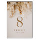 Um cartão de mesa de casamento de outono romântico e moderno com realismo fotográfico, apresentando um buquê floral seco neutro em tons de trigo, ocre e ferrugem.