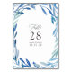 Cartões de número de mesa para casamento com folhagem azul naval e branco projetados para serem personalizados rápida e facilmente de acordo com os detalhes do seu evento.