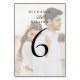 Esta elegante carta de números da tabela de casamento de fotos combina encantos pessoais com estilo sofisticado, apresentando uma foto de página de cheio suave sobreposta com texto. O grande número da mesa moderna é mostrado de forma destacada em preto, destacando-se lindamente contra a foto. Os nomes dos casais são colocados acima em uma mistura graciosa de fontes de script serif e caligrafia manuscritas, adicionando um eterno e um toque íntimo. Perfeito para adicionar personalidade ao decoro de recepção enquanto guia os convidados com facilidade, este design combina a funcionalidade com uma afirmação visual sincera.
