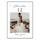 Este design de número da mesa de casamento apresenta um layout simples e elegante com um roteiro decorativo no topo, um número de tabela em negrito no centro e uma foto romântica do casal como ponto focal. O fundo branco limpo e o texto mínimo no fundo criam um olhar refinado, moderno e personalizado.