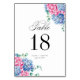 Número da Tabela de Casamento Hydrangeas Azuis, Rosa-d-água | Números de tabela personalizáveis com buquês de hidrangeas cor-de-água rosa e azul. Estes números florais são perfeitos para chás de fraldas de primavera e jardim, chás de panela, casamentos e muito mais. Personalize a parte de trás do convite adicionando uma foto ou qualquer imagem. Itens correspondentes estão disponíveis.