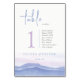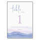 Número do Cartão de mesa com a paisagem da montanha Morning. Paisagem natural azul-suave. Silhuetas de montanhas e flores de dandelion. Número da placa de Mesa de fundo da pintura em aquarela. Coleção de Montanhas Roxas.