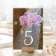 Adicione um toque de charme ao seu estilo de rancho chá de panela ou recepção de casamento com os números casuais, mas clássicos, da mesa de casamento da Orquídea Russa. Este design, informal e elegante, apresenta uma fotografia floral acesa de flores de orquídea cor-de-rosa, falaenopsis, sobre o caule, com um véu branco de brasa, com um fundo de madeira de cascata castanha.
