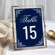 Placas de números de tabela elegantes, com borda branca elegante em ornamentado contra fundo azul escuro.