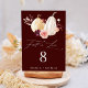 Este número da mesa de núpcias apresenta branco de aquarela e abóboras amarelas adornadas com burgundy, maroon e flores cor-de-rosa pinceladas sobre as folhas do outono. Para uma personalização mais avançada deste design, clique no BOTÃO FERRAMENTA DESIGN AZUL acima