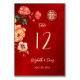 Esta colorida placa de número da mesa de casamento chinesa apresenta flores vermelhas, laranja, amarelas chinesas em um fundo vermelho brilhante. Convite de casamento chinês igual disponível.