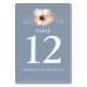 Estas cartas de números de tabela oferecem um lindo gráfico de aquarela de flores de pêssego e verde. O fundo é um azul empoeirado.