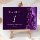 A borda direita desta elegante e moderna placa de número da mesa de casamento apresenta uma cor d'água roxa, borda agitada com falso brilho prateado. O texto personalizável combina fontes de serif romana de cinza prateada, itálico e de placa de cobre em fundo roxo profundo.
