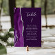A borda esquerda desta elegante e moderna placa de número da mesa de casamento apresenta uma cor d'água roxa, borda agitada com falso brilho prateado. A palavra "mesa" aparece no guião de escrita manual de cinzas prateadas sobre fundo de ameixa. Adicione os nomes dos seus convidados que estão atribuídos a cada mesa.