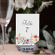 Bordo romântico de aquarelas cônicas pastel wildflower em azul claro, rosa e amarelo. Inclui campos de texto na frente e atrás para o número da tabela em fontes personalizáveis. Esta coleção encantadora é o complemento perfeito para o seu casamento com Primavera, Verão ou jardim.