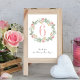 Um cartão de mesa de casamento mostrando uma coroa floral com rosas amarelas e cor-de-rosa. Obrigado por compartilhar nosso dia em uma fonte de script na parte inferior da placa.