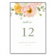 Cartão floral de número da mesa de casamento com lindas flores pintadas a aquarelas.
