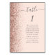 A borda esquerda desta elegante e moderna placa de número da mesa de casamento apresenta uma borda falsa de ouro rosa. A palavra "mesa" aparece em cinzas de carvão e escrita à mão em um fundo cor-de-rosa pincelado. Adicione os nomes dos seus convidados que estão atribuídos a cada mesa.