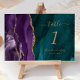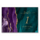 A borda esquerda desta elegante e moderna placa de número da mesa de casamento apresenta uma cor d'água púrpura e borda agitada com falso brilho dourado. O texto personalizável combina manuscrito dourado e fontes itálicas e em prato em um fundo branco azul de cor aquática.