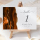 A borda esquerda desta elegante e moderna placa de número da mesa de casamento apresenta uma borda de cor de água laranja queimada, aparada com falsa brilho dourado. O texto personalizável combina a escrita manual de cinzas de carvão, as fontes itálicas e de chapa em um fundo branco.
