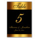 Este elegante cartão personalizado de número da mesa de casamento apresenta o número da tabela na caligrafia faux gold script com os nomes da noiva e do noivo e a data do casamento em um fundo preto junto com ouro brilhante. Desenhada por Susan Coffey.