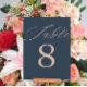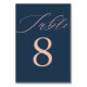 Melhore sua capa de mesa de casamento com este elegante sinal de número de mesa azul escuro, com sofisticada caligrafia rosa dourada. O fundo azul profundo complementa lindamente o roteiro luxuoso do ouro rosa, criando um olhar moderno e refinado que adiciona estilo a cada configuração de mesa. Perfeito para casamentos contemporâneos, este sinal de número de tabela é funcional e decorativo, guiando convidados para seus assentos e adicionando um detalhe chic coeso à sua decoração.